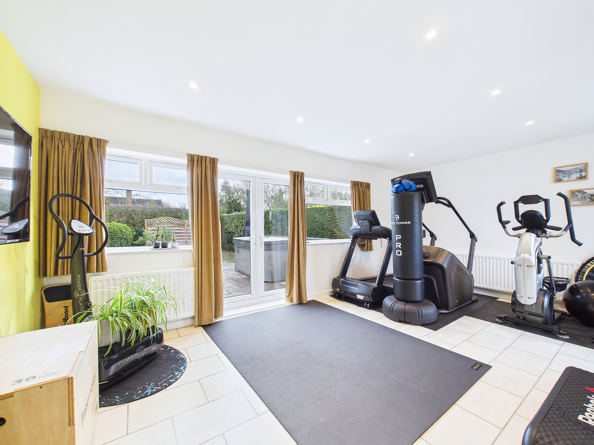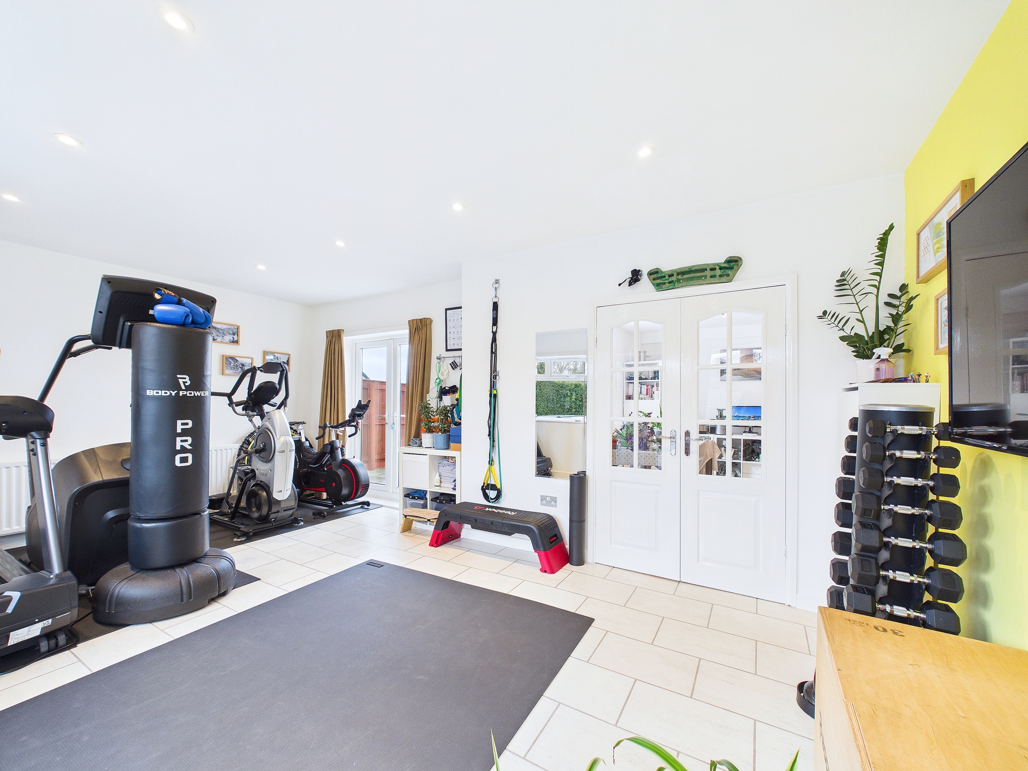 Located just off the kitchen dining room, this garden room flows through double doors, creating a bright, open-plan space for the whole family. Two sets of French doors each lead out to their own patio, bringing the garden within easy reach and making alfresco summer dining an absolute pleasure. This room is currently used as a gym.Â