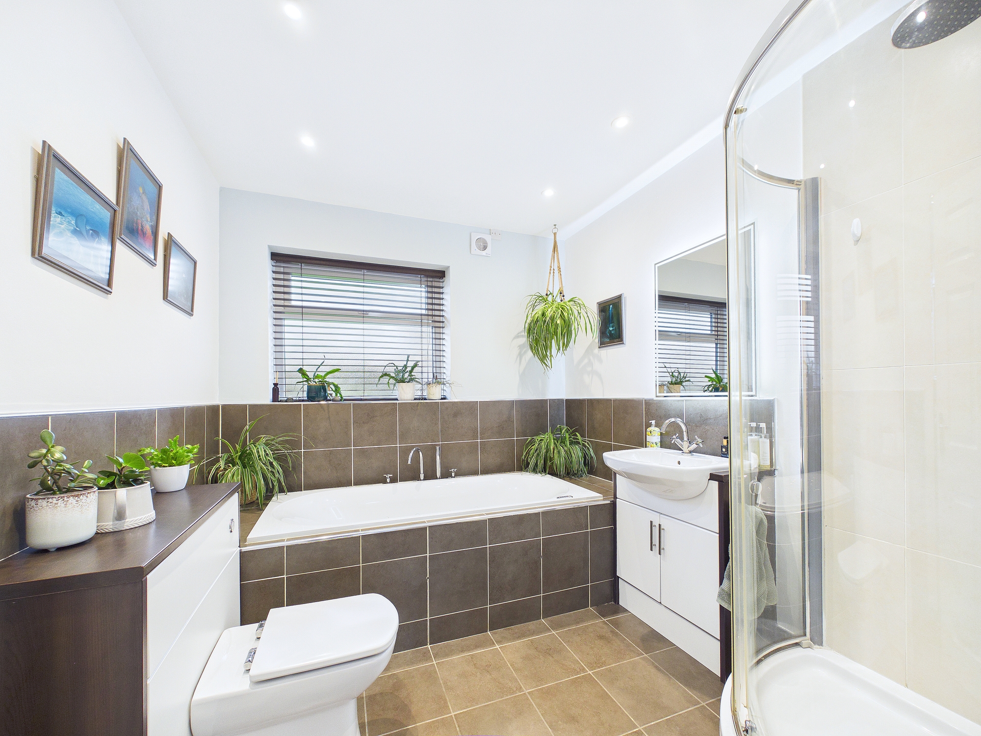 This spacious family bathroom has a relaxed feel, designed for easy everyday living. It features a separate shower cubicle alongside a stylish, deep bathtub – giving you the perfect setup for both convenience and relaxing.