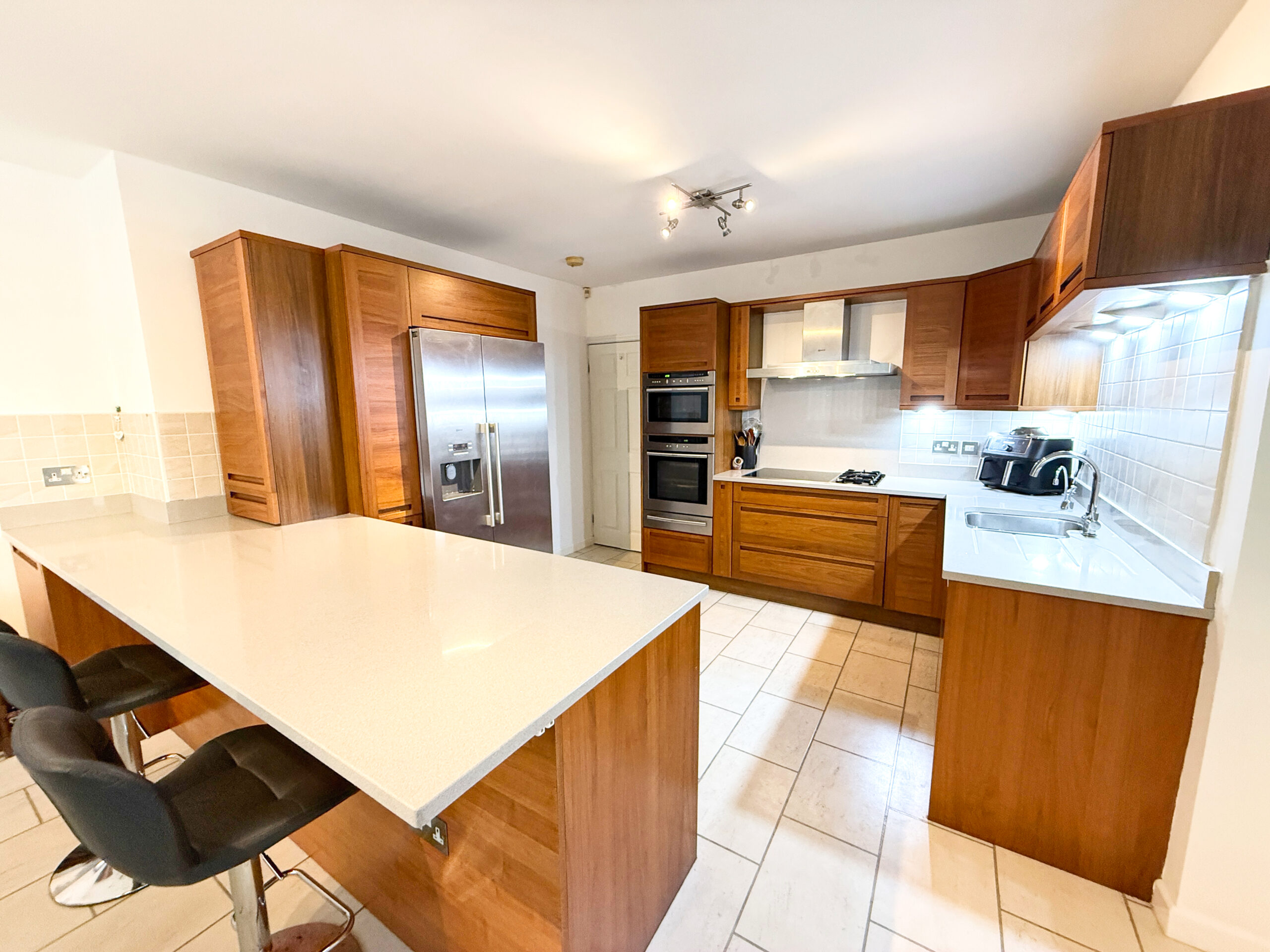 The kitchen here really is the heart of the home – bright, spacious and perfect for everyday family life and entertaining. There’s plenty of room for a good sized dining table, and the easy-going breakfast bar makes it a perfect place to chat, cook or just enjoy a morning coffee. Double doors open straight into the garden room, giving the whole space an open flow. The kitchen units have been thoughtfully chosen, with a great range of fixtures and fittings that suit the needs of a modern family, including a double oven, induction and gas hobs, pan drawers, integrated dishwasher and space for an American style fridge/freezer.