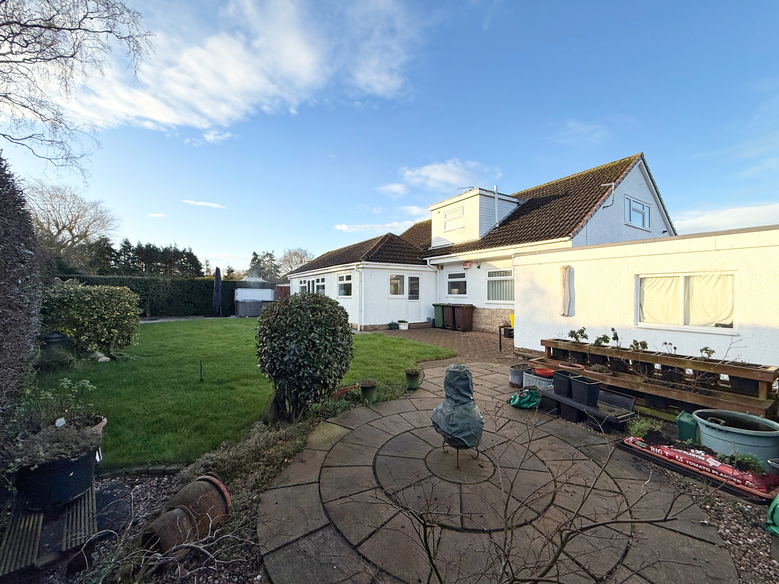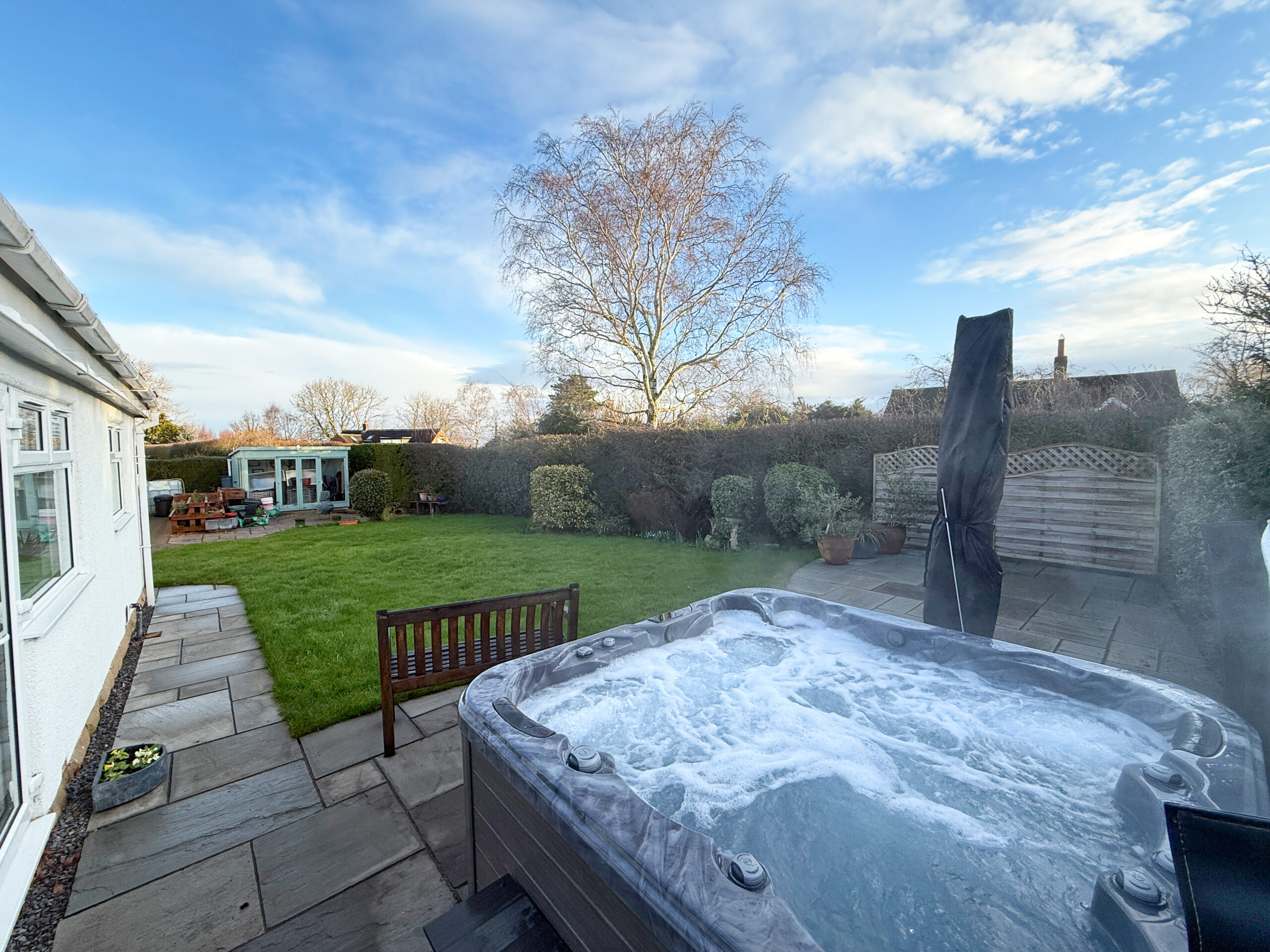 Offering several patio areas, each perfectly placed to enjoy the sunshine from morning to evening. Easily maintained with lawn, mature shrubs and hedges, this lovely outdoor space provides both privacy and plenty of places to unwind.