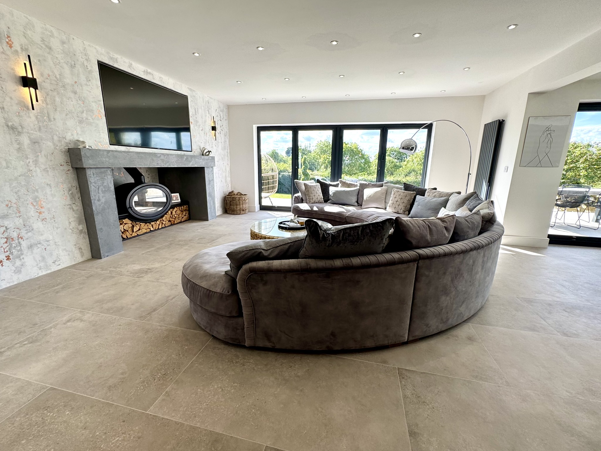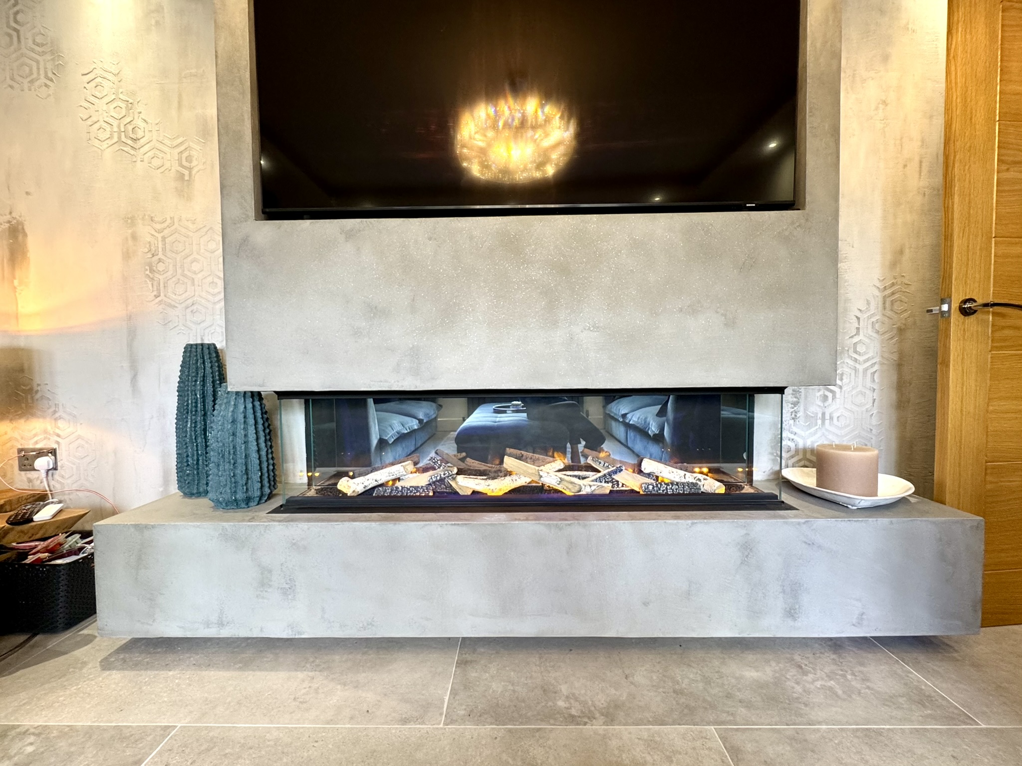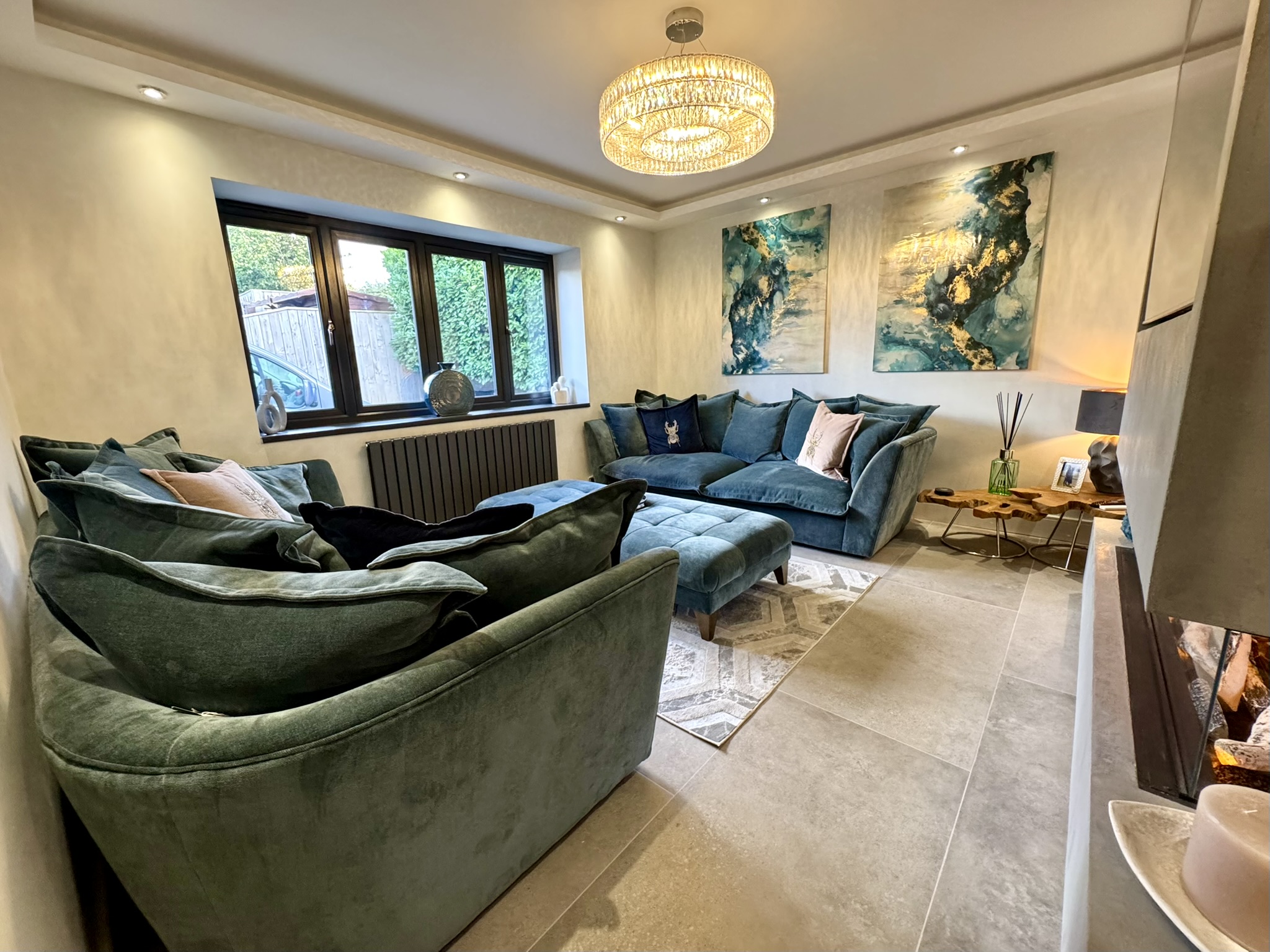 A stylish reception room, offering a cosy yet luxurious retreat and featuring a modern Venetian plaster surround, recessed ceiling lighting, space for built-in tv.