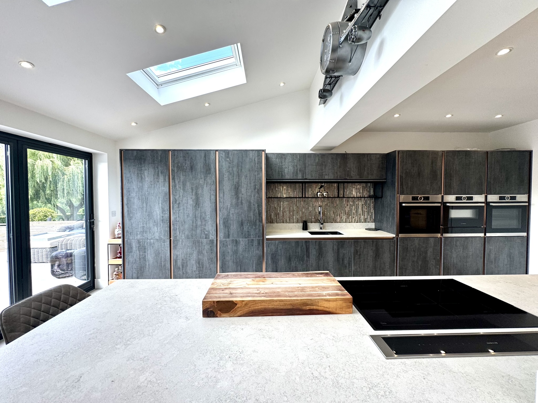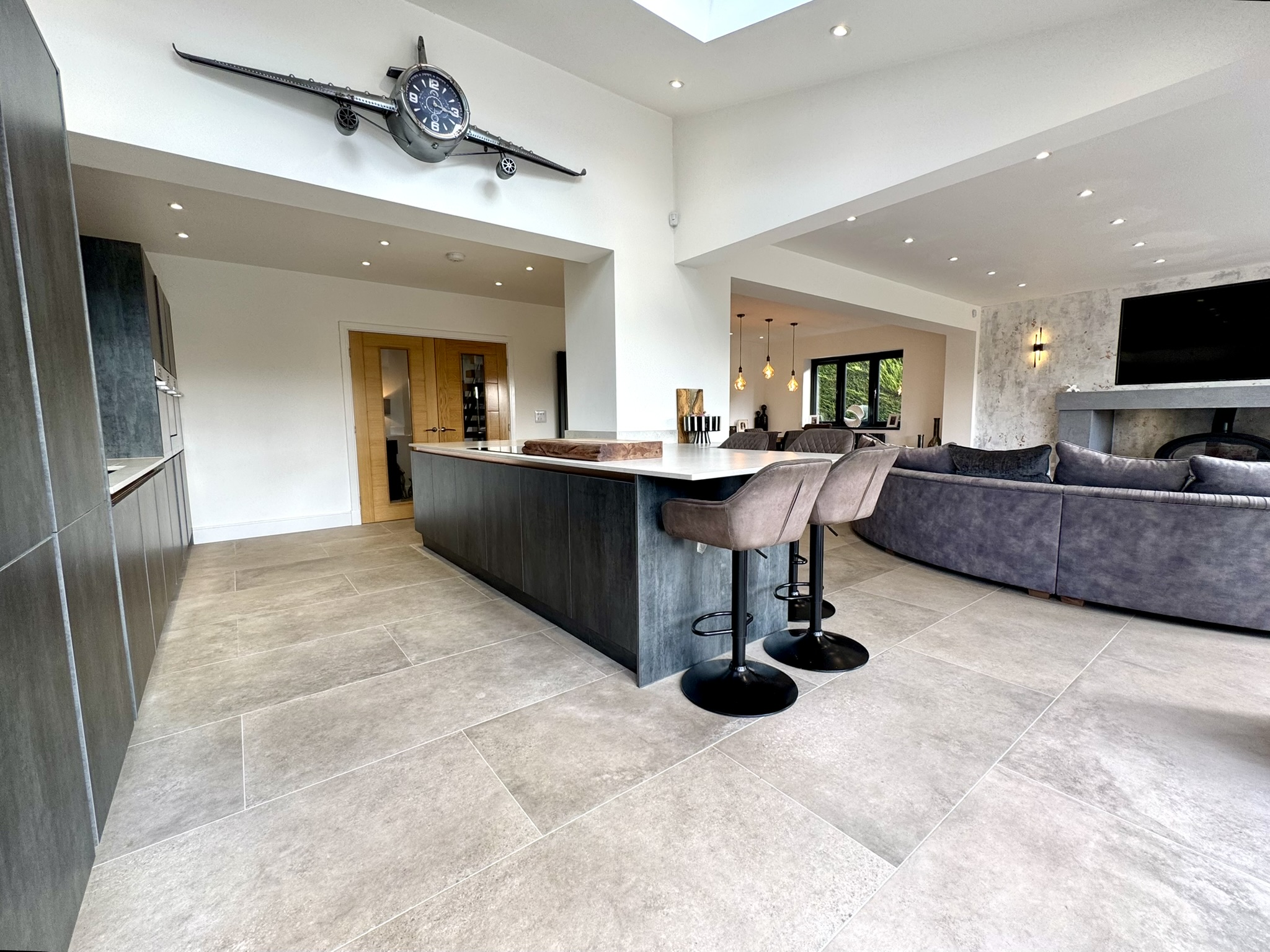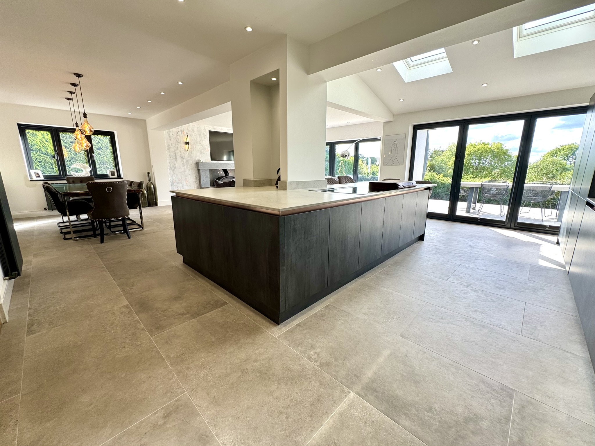 This is open plan living at its very best. Skilfully designed, with exceptional attention to detail and distinct zones for cooking, dining for smaller and larger numbers and space for the most comfortable seating imaginable. Sleek and contemporary but also inviting – feeling very much the heart of the home. Featuring an impressive vaulted ceiling with Velux windows, two sets of bifold doors creating the perfect indoor/outdoor room and opening onto the south west facing rear terrace, together with modern log burner with Venetian plaster surround. Space for built-in tv. Dining area with a run of built-in units.Â