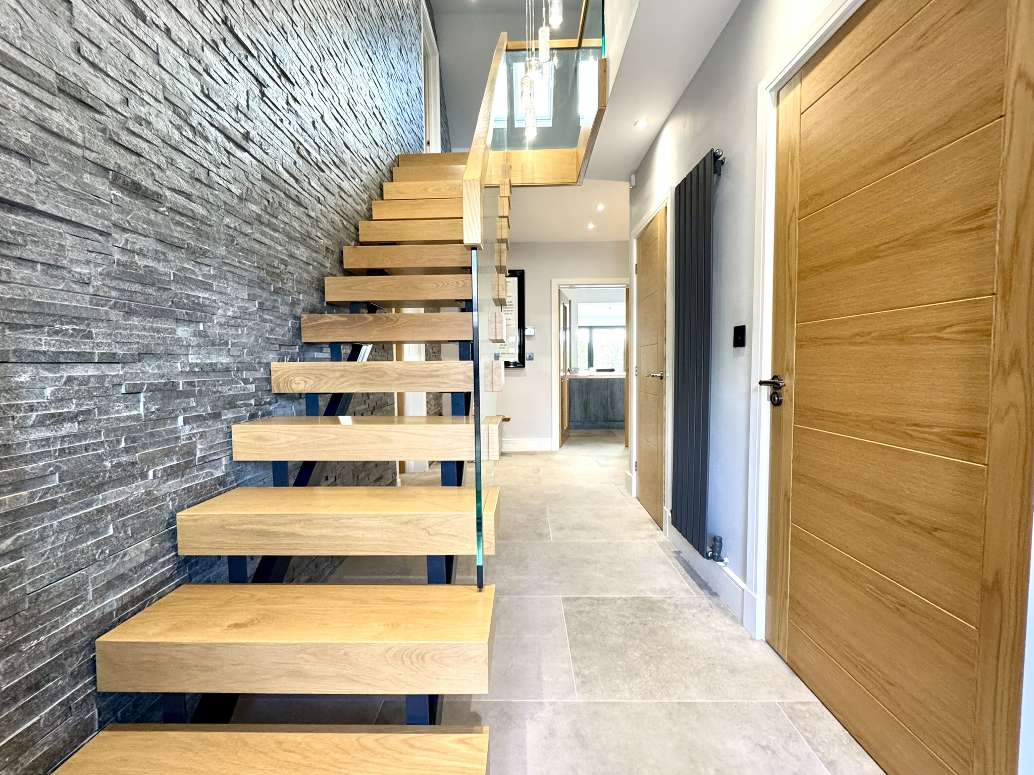Spacious and welcoming with open-tread oak staircase and glass panelling, tiled feature wall. Door to: Cloakroom/WC.