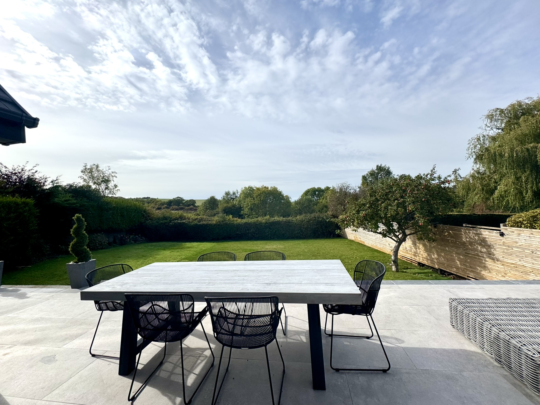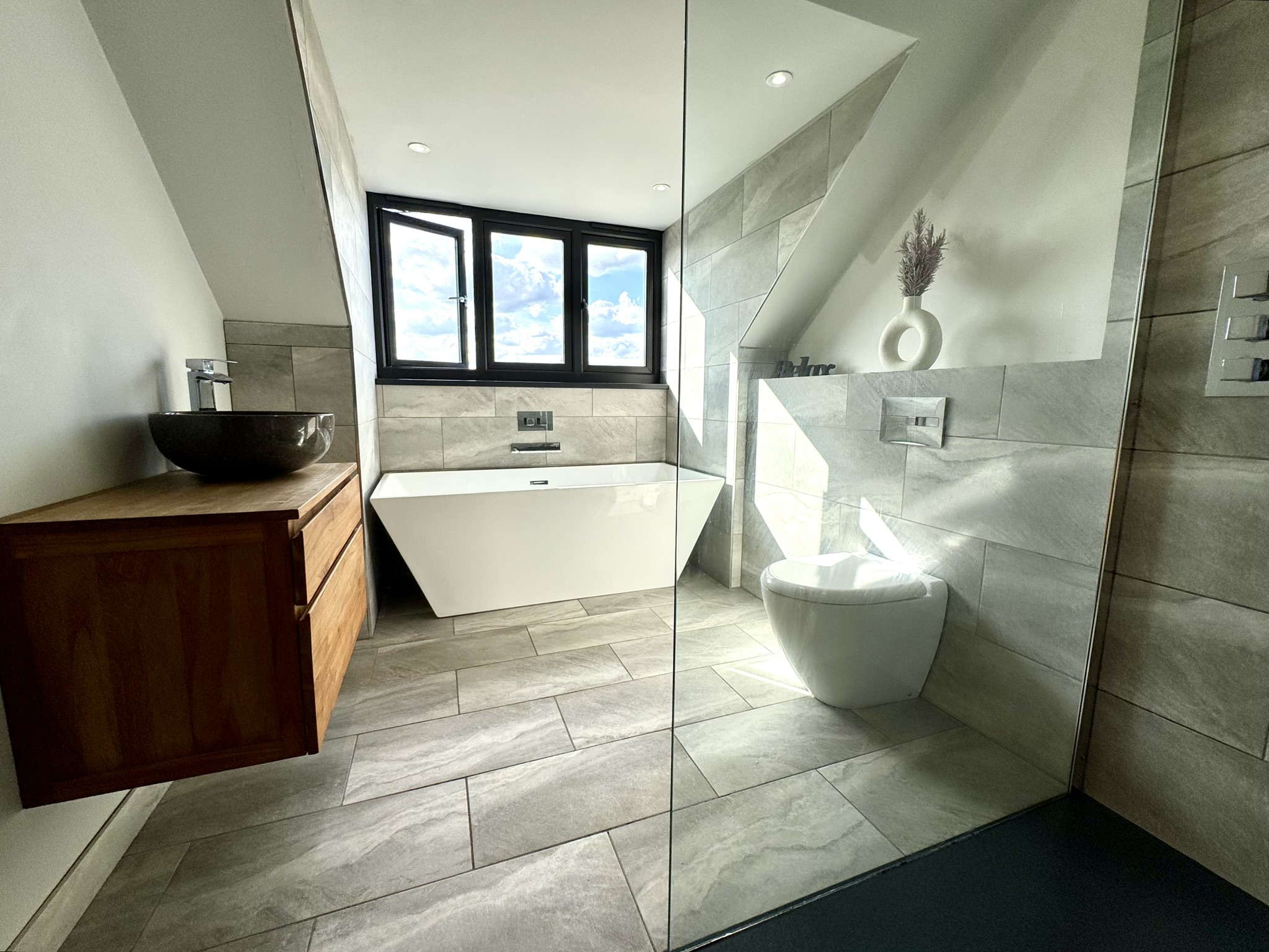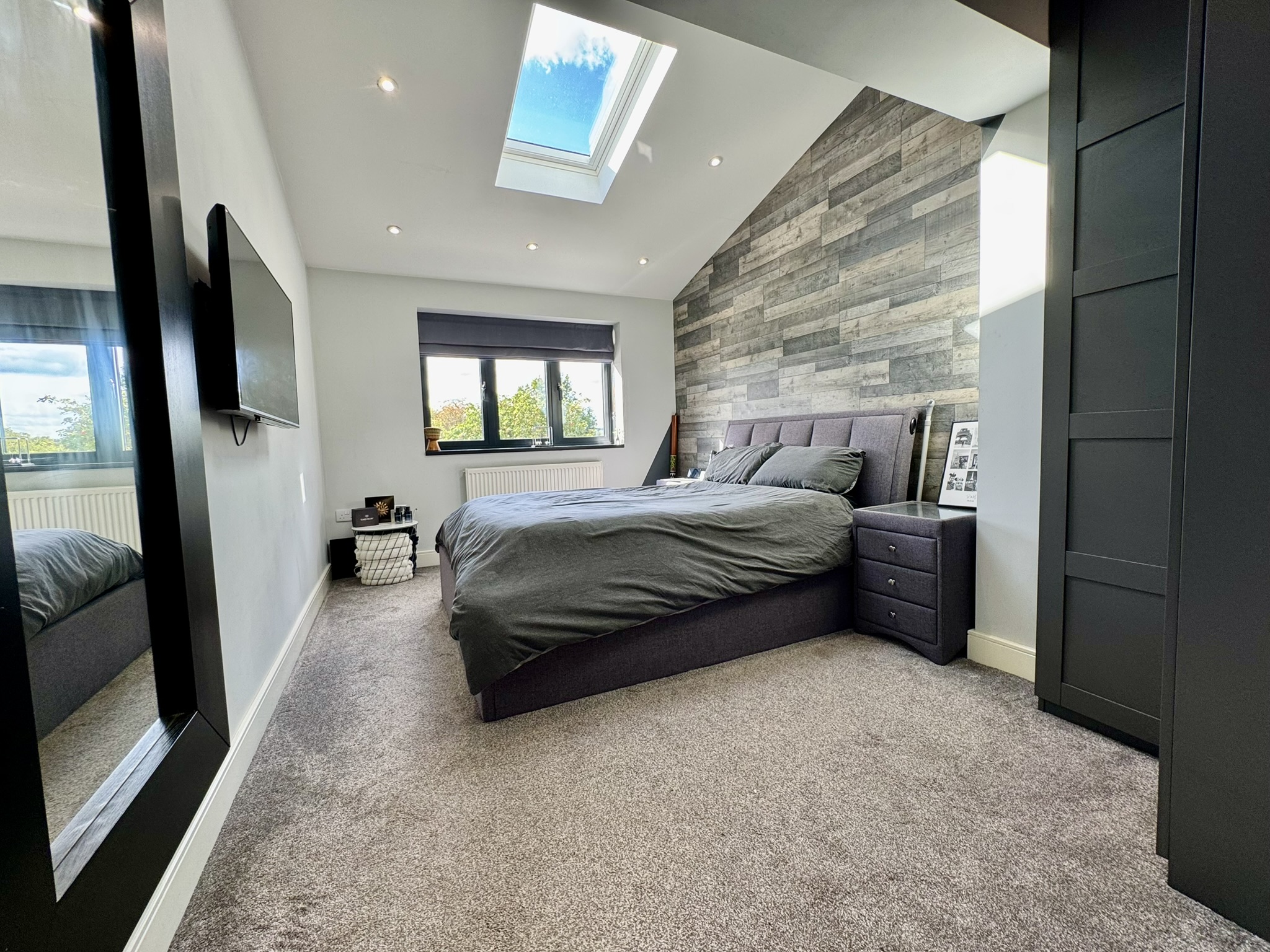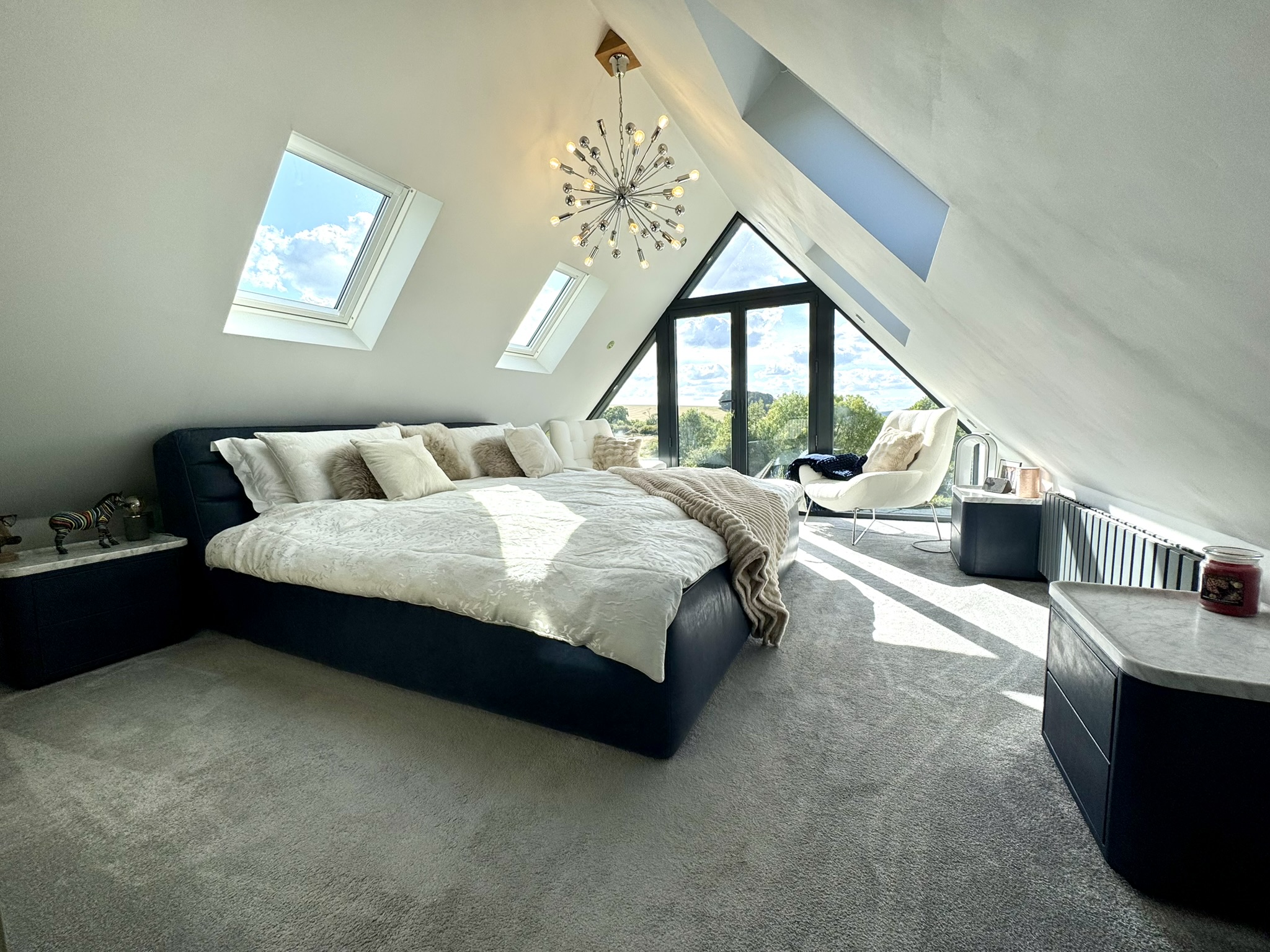 A stunning and luxurious suite, designed as a retreat, and to make the most of the wonderful view. Large window, feeling like a wall of glass, overlooking the garden and open fields, plus four Velux windows.