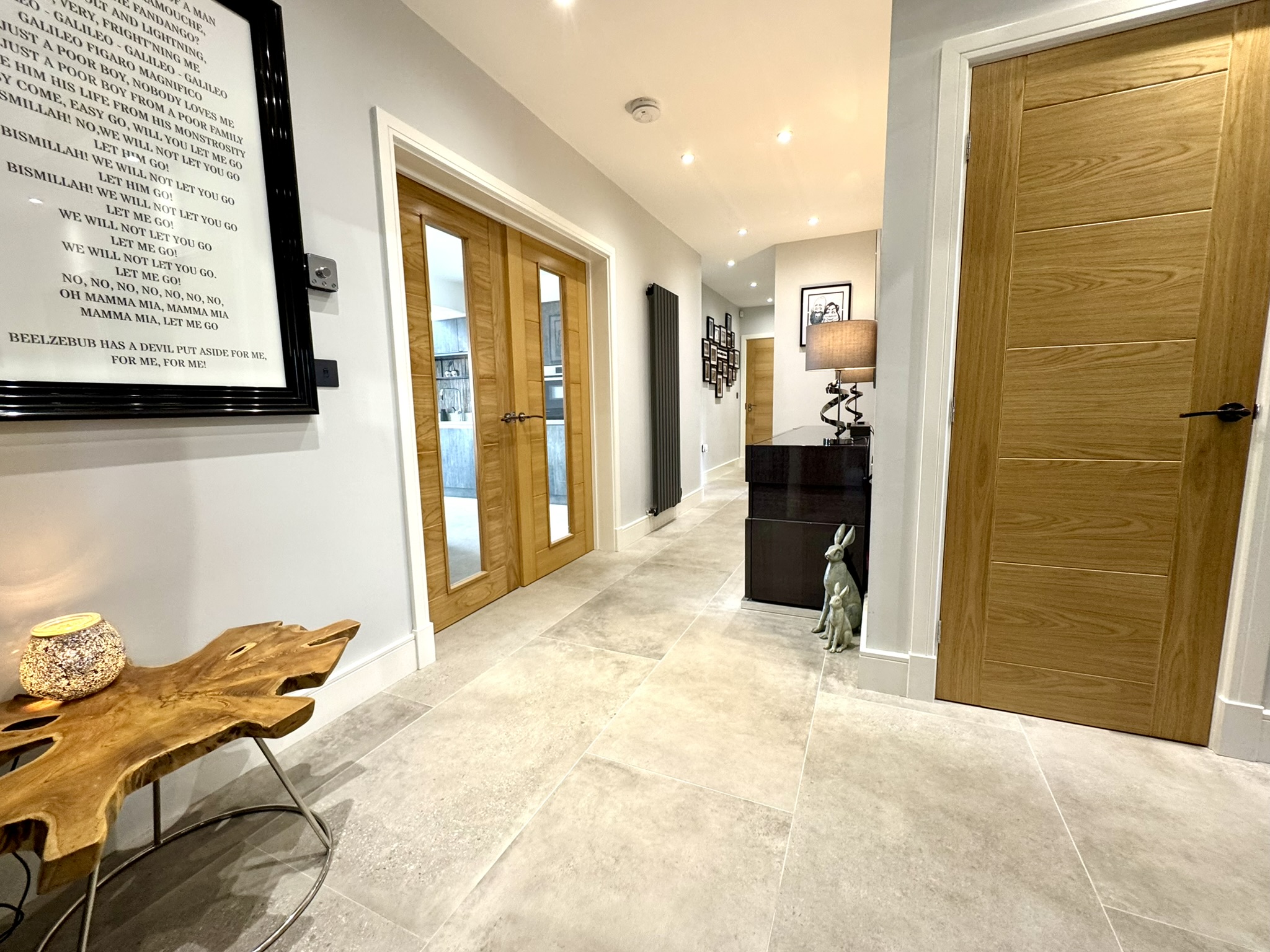 Designed with the keen cook in mind and fitted with contemporary units, which have elegant rose-gold detailing. Quartz worktops, including a large central island with a breakfast bar. Integrated appliances: full-sized fridge and freezer, two ovens, microwave, warming drawer, dishwasher and induction hob with pop-up extractor.