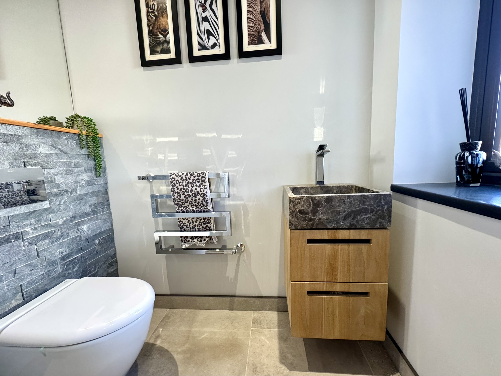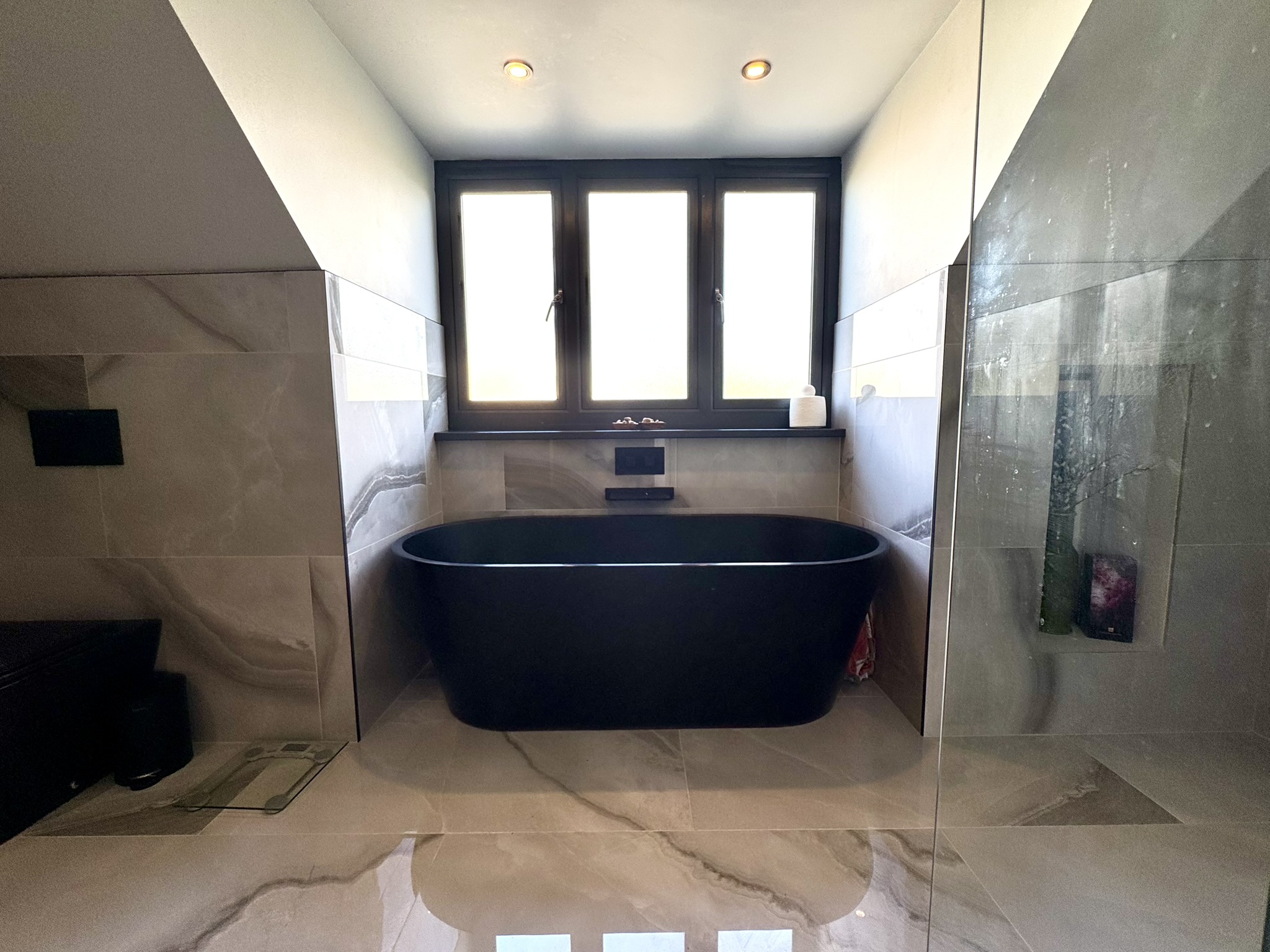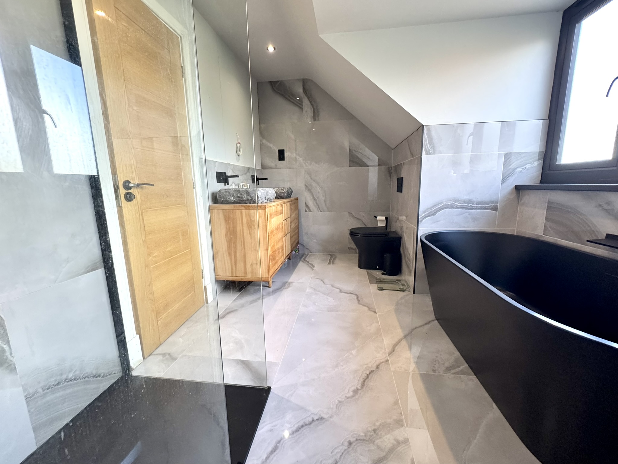 En-Suite Bathroom – Pure luxury with walk-in shower, freestanding bath, double marble basin unit, part-tiled marble walls.