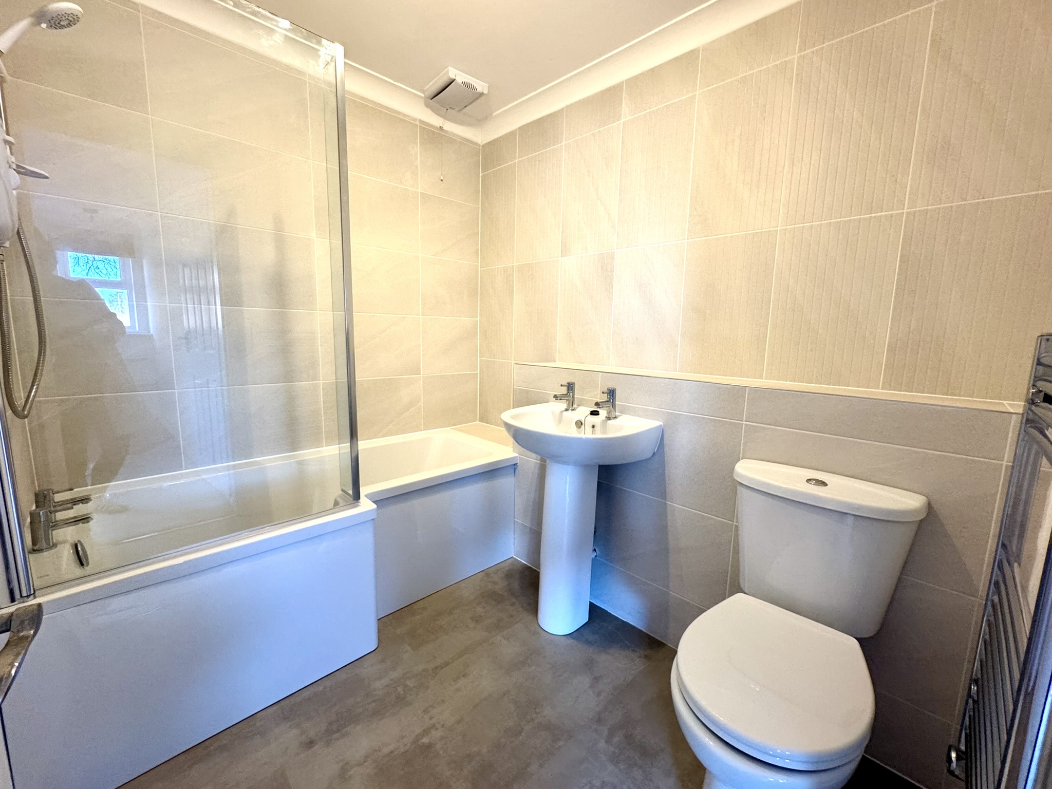 Recently updated and fitted with a white suite, comprising panelled bath with shower over and glass screen, pedestal wash hand basin and low-level wc. Additional features include part-tiled walls, laminate flooring, and a ladder style towel rail.