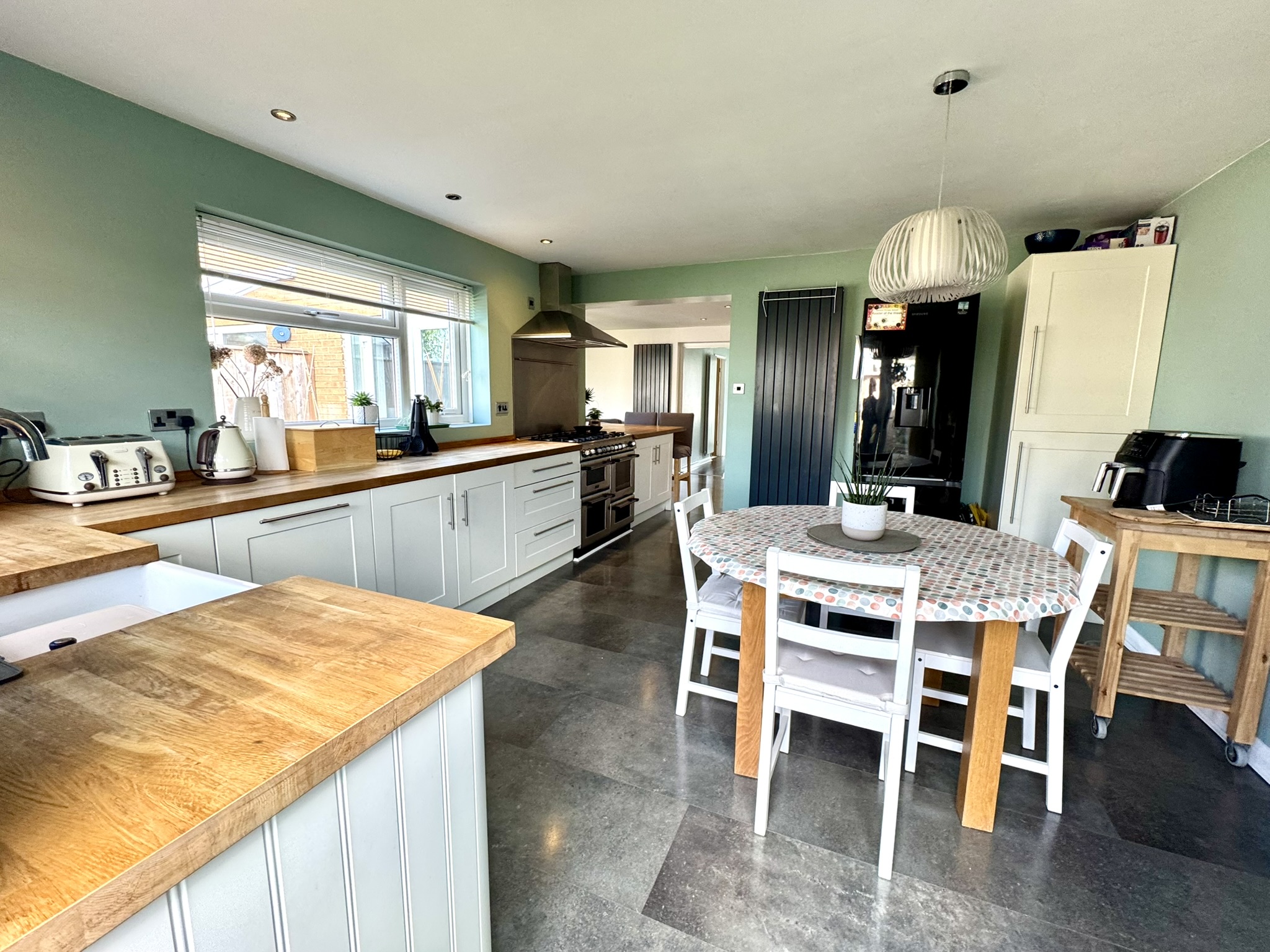 Kitchen Dining Area – The French doors and dual-aspect windows overlooking the garden, flood the room with natural light. Here there is plenty of room for a good sized dining table, plus the bonus of a breakfast bar, which creates a perfect place to chat or just enjoy a morning coffee. The kitchen area has been thoughtfully fitted for the cook, with an extensive range of base units – including much coveted pan drawers – complemented by solid wood worktops, Belfast sink and contemporary radiator. Additional features include: integrated dishwasher and spaces for a range-style cooker and fridge freezer.