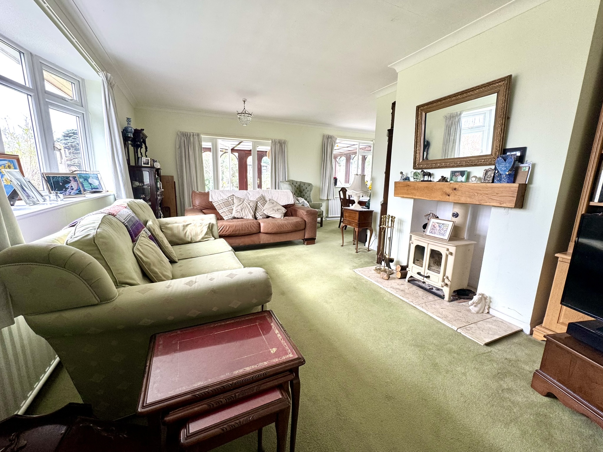 Living Area – featuring a large south-facing bow window that fills the space with natural light and is complemented by a charming log burner set on a marble hearth with an oak beam mantle, and which provides a cosy focus for the seating area. Two windows and a glazed door link to the conservatory and the lovely garden views beyond. Â
