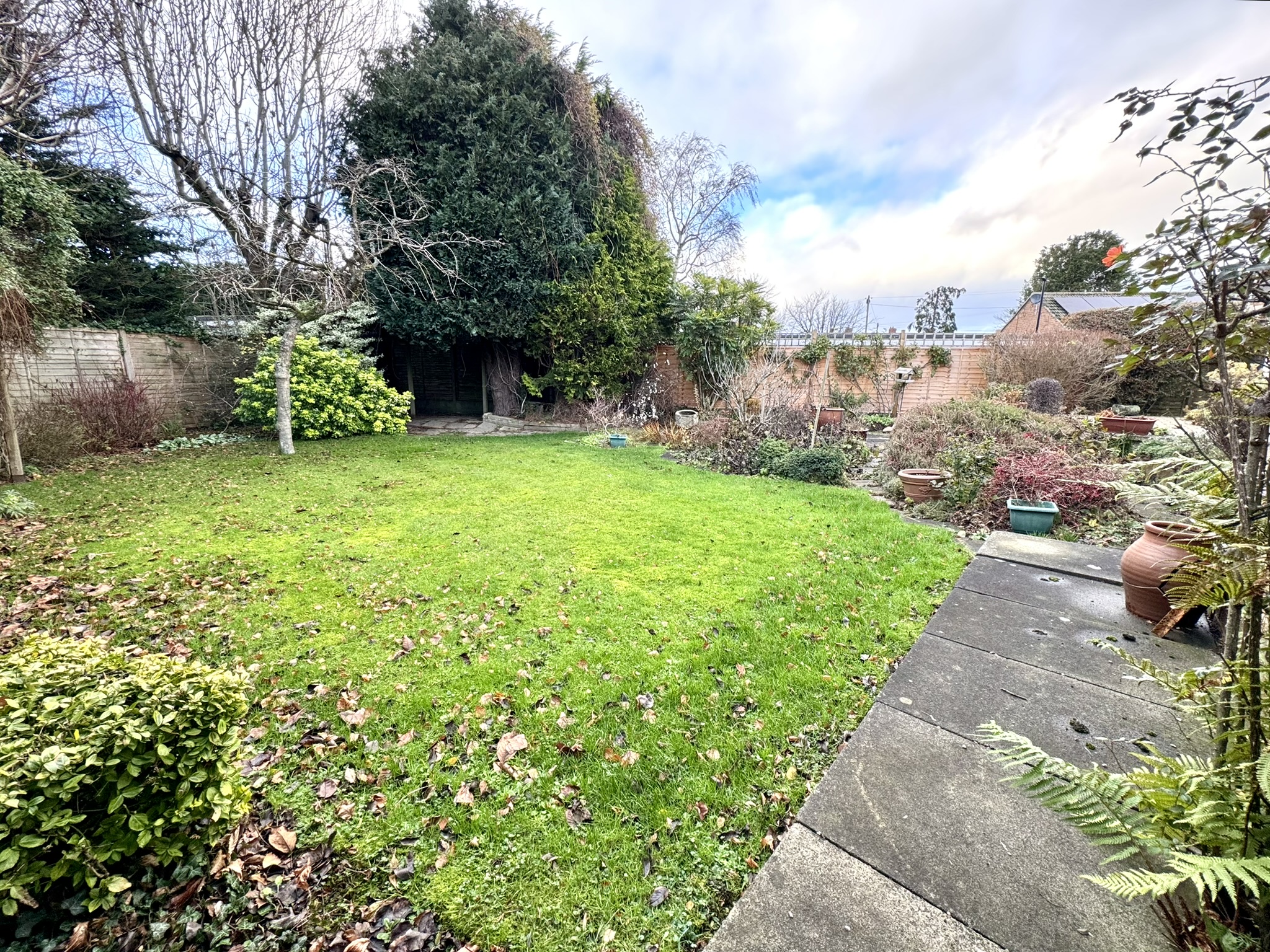A beautifully mature west-facing garden laid mainly to lawn, with established flower beds, fenced and hedged boundaries and a patio area. A paved pathway leads to a pagoda and secondary seating area. To the side is a paved section with a wooden summer house.